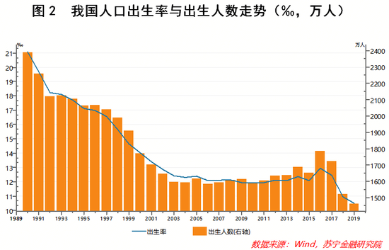 在我国,人口出生率走低已经是不争的事实。Wind数据显示,自1990年以来,我国人口出生率一路下滑,从1990年的21.06‰降至2015年的12.07‰。尽管2016年受“全面二孩政策”影响,我国人口出生率一度明显回升,但在此后三年里又出现了连续下降,2019年仅为10.48‰,比2018年下降了0.46个千分点,创下了历史最低值(见图2);与之相应的是2019年我国出生人口1465万人,比2018年减少58万人——这已经是自2016年以来出生人口的连续第三年减少。