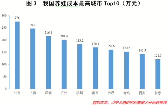 另有数据显示,在全国养娃成本最高的10座城市里,排名最高的北、上、深、广均在200万元以上,就连排名第10的长春也要121.5万元(见图3)。难怪会有人说,“养大一个娃,就要消灭一个百万富翁”。
