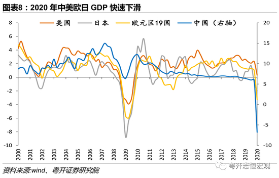 2020年一季度疫情主要在中国集中爆发,致使中国实际GDP同比-6.8%,创1992年有季度数据以来最低。美欧日一季度GDP同比增速同样有所下滑,分别为0.3%、-2%和-3.3%。疫情初期导致中国的供需同时收缩;其后抑制供给,因为疫情防控导致原材料、人力不能自由流动;再次是影响总需求不足,亟需超常规的财政和货币政策刺激。