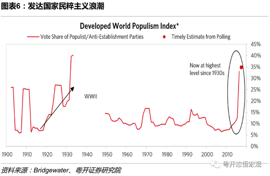 在全球政治思潮的演变中,民粹主义的广泛兴起是一个不可忽视的现象。全球经济复苏乏力、日益拉大的贫富差距和分配不均加剧了民众的不满,这为逆全球化和民粹主义的滋生提供了肥沃的土壤。民粹主义崛起的最突出表现即是民粹主义政党得势与民粹主义领导人上台,如法国“国民联盟”、意大利联盟党、德国选择党,现任美国总统特朗普、英国首相鲍里斯、墨西哥总统奥夫拉多尔、匈牙利总理欧尔班、印度总理莫迪、菲律宾总统杜特尔特等都是民粹主义的代表人物。此外,一些原本并非民粹派的领导人也逐渐被民粹主义裹挟,如土耳其总统埃尔多安等。桥水基金的报告显示,2016年以来的发达国家民粹主义浪潮已达到1930年代以来的最高峰。