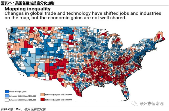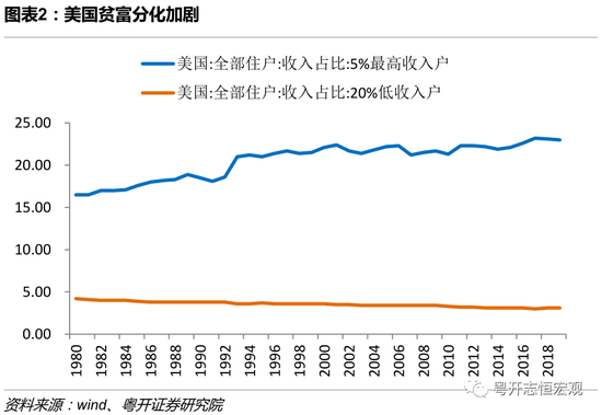 贫富差距与经济增长存在显著负相关关系,短期来看贫富差距拉大将大幅抑制消费,长期来看将进一步降低劳动生产率,使得经济潜在增速放缓。贫富差距的拉大本质是财富向极少数人群中集中,低收入人群占比上升。由于低收入人群边际消费倾向更大但没有消费能力,而高收入人群拥有消费能力但边际储蓄倾向更大,因此一国国民收入分配结构将对本国消费产生显著影响。贫富差距拉大不仅造成边际消费需求大幅下降,还将使得需求结构明显偏左,出现较为严重的消费断层。此外,从长期来看,贫富差距持续加大将使得中低收入人群接受教育、培训、健康生育的意愿和能力进一步下降,从而使得劳动生产率和经济增长受到负面影响。据IMF测算,若将全球人群收入做五等分,收入在前20%的最高收入人群富裕程度每增加一个百分点将使一国未来五年GDP增长降低0.08个百分点,而收入在后20%的最低收入人群的富裕程度增加一个百分点能使GDP增长提高0.38个百分点。换而言之,提高穷人和中产阶级的收入可有助于提升经济增长前景,而贫富差距加大将对经济增长带来负面影响。