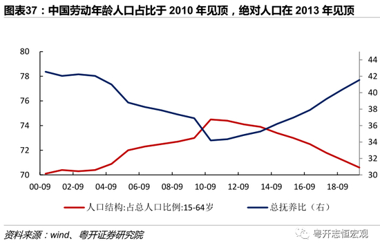 二是中国人口数量红利消失,人口危机渐近。从总量看,2013年中国15-64岁劳动年龄人口达到峰值10.06亿人,2018年降至9.94亿人。从结构看,2010年中国15-64岁劳动年龄人口占总人口比重为74.5%,达到历史最高点;人口抚养比(非劳动年龄人口与劳动年龄人口之比)为34.2%,达到历史低点。