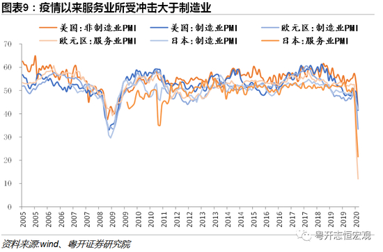 从全球其他经济体看,伴随3月疫情在美欧日地区的快速扩散,4月美欧日制造业PMI断崖式下跌,分别为41.5%、33.4%和41.9%,创次贷危机以来新低。此外,服务业受疫情冲击影响范围及幅度更深,4月美欧日服务业PMI分别为41.8%、12%和21.5%,创有数据以来历史新低。全球贸易活动同样降至冰点,2020年3月波罗的海干散货指数自年初快速下滑并维持在2016年初以来低点。IMF预测2020年全球经济负增长3%,其中发达经济体和发展中经济体经济增幅预计分别为-6.1%和-1%。企业复工、生产及投资受重创进一步导致大量居民失业,失业率大幅飙升。2020年4月美国非农失业人数超过2000万,当月初次申请失业金人数2016万人,失业率飙升至14.7%,创二战以来新高。