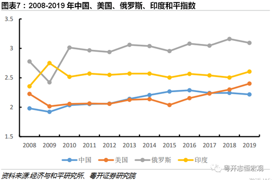 除潜在的战争危机外,非传统安全威胁也愈发突出,尤以恐怖主义为甚。受到宗教、政治、经济等多种因素的影响,中东-北非地区成为恐怖主义的温床,基地组织、“伊斯兰国”、“索马里青年党”、“博科圣地”等恐怖主义组织发起了大量恐怖主义袭击,造成了严重的人员伤亡、财产损失和社会恐慌。当前,世界上的主要大国均面临着恐怖主义的威胁,欧洲在恐怖主义的蔓延中首当其冲,中国、美国、俄罗斯等大国也饱受恐怖主义的困扰,国家和平指数连年上升(注:和平指数越高表示国家安全程度越低),国家安全程度下降。