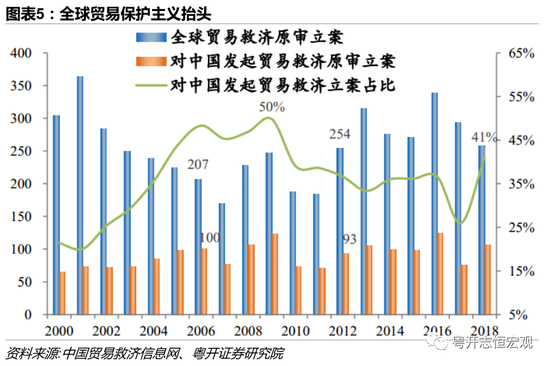 2001-2007年全球贸易救济原审立案(含反倾销、反补贴、保障措施等)数量呈下降趋势,2001年立案364起,2007年降至170起,但在金融危机后贸易救济立案增长迅速,显示贸易保护主义抬头。2008和2009年立案分别达228和247起,较上年分别增长34.1%和8.3%,2010和2011年全球贸易萎缩,立案数量处于低点,此后迅速增长。2012年和2013年立案数量达254起和315起。其中,对中国发起的贸易救济立案占全球总立案比重比从2001年的20%上升到2009年的50%。且贸易保护主义并非仅在发达国家抬头,发展中国家同样呈现如此。2009年,对中国发起贸易救济立案的排名前三申诉国分别是印度(25起)、美国(23起)和阿根廷(19起)。