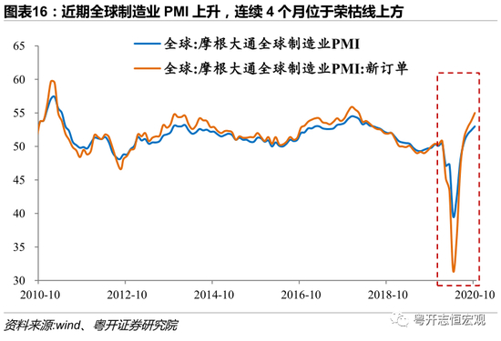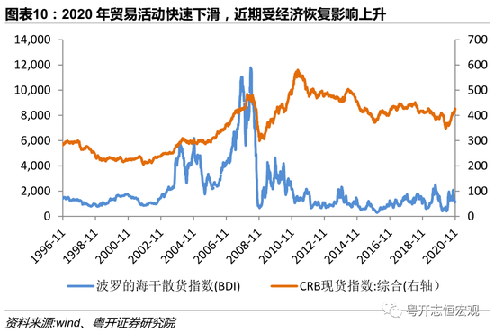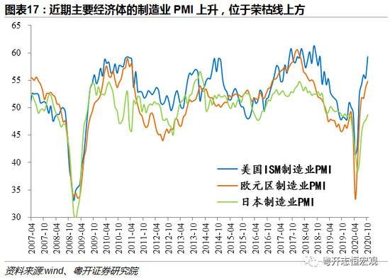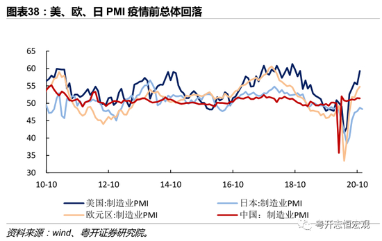 2020年6月起,由于疫情防控逐渐到位、各国复工陆续推进、各国经济刺激不断落地,全球经济整体呈现疫后反弹态势。10月全球综合PMI回升至53.3%,制造业PMI回升到53%,新订单指数上升至55%,均连续4个月高于荣枯线。其中,美、欧盟和日本制造业PMI分别上升至59.3%、54.8%和48.7%。10月全球OECD综合领先指标经过6个月的连续回升,反弹至99.2,美、欧盟和日本分别回升至98.98、99.13、99.28。10月初波罗的海干散货指数继5月的峰底不及400回升至新的峰值2097,全球贸易活动在疫后回暖。