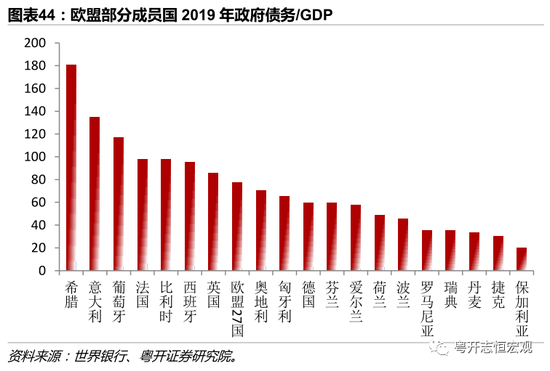 2)欧盟部分经济体希腊、意大利、葡萄牙等国政府债务率高企,2019年政府债务占GDP比重分别为180.5%、137.4%和117.2%,超过上轮欧洲主权债务危机的水平,且经济增速低迷,财政状况恶化,意大利失业率常年在10%以上;