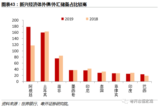 3)新兴经济体如阿根廷、哥伦比亚、土耳其、巴西等国外债/经常项目收入之比较高,达到200%以上,外债负担沉重;