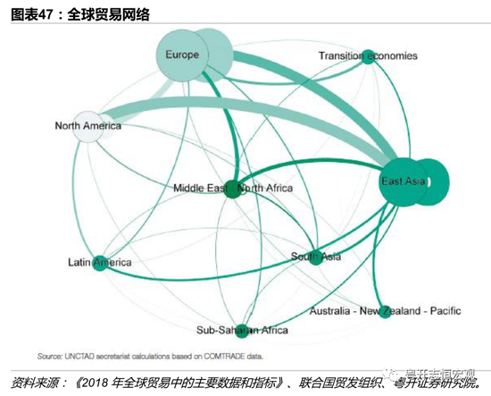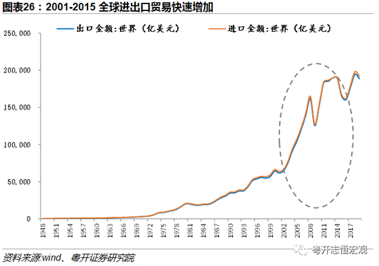 2001-2015年是全球自由贸易的黄金时期,以WTO体系为代表的全球贸易体系推动全球贸易量快速攀升。各国利用比较优势根据自身经济发展状况进行生产,并在全球形成以美欧为代表的消费国、以中国为代表的制造国和以拉美国家为代表的资源国三层体系。二战结束至今,全球大致发生了三次阶段性国际产业转移浪潮。第一次转移发生于二战结束-20世纪60年代,美国集中国内力量发展新兴通讯、电子、自动化工业等技术密集型产业,并将技术密集程度较低的纺织、钢铁、造船以及普通工业机械等对日本和西德进行转移,日本借此机会成为继英国与美国之后的第三个“世界工厂”。第二次转移发生于20世纪60-80年代,“亚洲四小龙”利用本地廉价而良好的劳动力优势,适时调整经济发展策略承接劳动密集型制造业而发展迅速,成为东亚和东南亚继日本后新兴的发达国家或地区。20世纪90年代开启的第三次产业转移推动了中国的工业化进程,资本密集型产业与部分劳动密集型产业逐步转移至中国内地,中国成为第三次产业链转移的受益者,经济迅猛发展并由此成为“世界工厂”。从历次产业转移的进程来看,历次产业链转移发生后全球贸易自由化程度总体呈现上升趋势,各国利用自身比较优势从事专业生产,经济效率得以提高。特别是在2001年中国入世以来,全球逐步形成以美欧为代表的消费国、以中国为代表的制造国和以拉美国家为代表的资源国三层体系,全球资源配置效率大幅提升、世界贸易规模快速上涨。