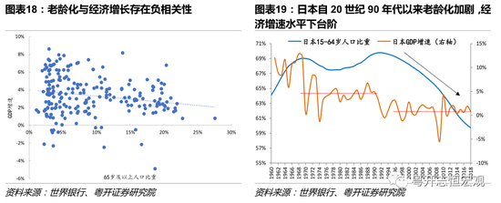 老龄化对总体需求、投资产生负面影响,整体经济增长潜力下行。人口老龄化加剧主要从供给、需求两个方面对经济产生负面影响:一是人口老龄化趋势下,适龄劳动力供给下降,导致社会生产能力不足,经济增速下降。二是人口老龄化将使得整体社会需求下行,新增就业人口减少、新增人口提供公共服务和基础设施需求减少、新增人口居住需求减少将分别导致制造业投资、基建投资和房地产投资放缓,削弱经济增长动力。我们将2018年各国65岁以上人口比重与经济增速进行回归,可发现老龄化程度与GDP增速存在显著的负相关关系。而从历史经验来看,一国人口高速增长、劳动年龄人口比重提升的时期,经济增速往往较高,一旦老龄化程度加剧,则经济整体增速逐步下行,如日本老龄化自20世纪90年代加剧,15-64岁人口所占比重自1993年的69.8%一路下降至2018年的59.7%,期间日本经济增速中枢持续下滑。