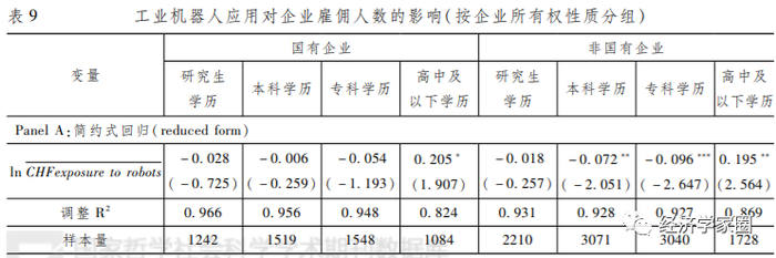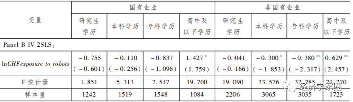 为了验证上述分析,本文根据企业的所有权性质将企业分为国有企业和非国有企业两个子样本进行分组回归。如表9所示,简约式回归结果表明,工业机器人应用对劳动力的替代效应主要发生在非国有企业中。其中,工业机器人渗透度对本科学历员工的替代弹性为-0.072;对专科学历员工的替代弹性为-0.096;而对于高中及以下学历的员工,工业机器人渗透度每增加1%会导致对其需求量增加0.195%。但是在国有企业样本中,工业机器人应用对不同学历层次的员工雇佣人数均无显著的替代效应。基于IV 2SLS的回归结果与上述结论一致。