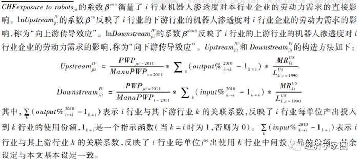 一个行业的机器人应用水平不仅会对本行业企业的劳动力需求产生直接影响,还会对产业链上下游行业的其他企业的劳动力需求产生间接影响。为完整地识别机器人应用对就业的影响,本文借鉴Acemoglu et al.(2016)的做法,利用2010年中国投入产出表数据构建行业关联权重,检验机器人应用的产业链传导效应,识别方程如下: