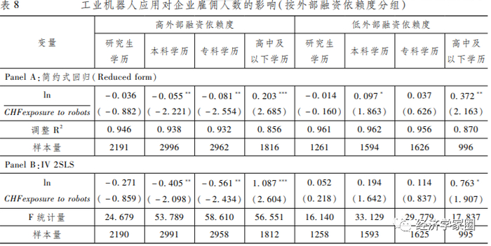 为了验证上述分析,本文参照Rajan &Zingales(1998)的做法,以美国对应行业中所有上市企业的样本中位数刻画某一行业的外部融资依赖度,并根据制造业全行业外部融资依赖度的中位数把全样本划分成高外部融资依赖度和低外部融资依赖度两组分别回归。如表8所示,简约式回归结果表明,在高外部融资依赖度的行业中,工业机器人渗透度每增加1%,会导致企业对本科学历的劳动力需求量减少0.055%,对专科学历的劳动力需求量减少0.081,对高中及以下学历的劳动力需求量增加0.203%。但是对于低外部融资依赖度的企业而言,工业机器人渗透度提高对不同学历层次的劳动力需求均无替代效应,反而对本科学历和高中及以下学历的劳动力需求有一定的挤入效应。基于IV 2SLS的回归结果与上述结论一致。与美国等发达国家相比,中国的金融市场尚不健全,企业的外部融资成本较高。在此背景下,机器人技术的应用有助于缓解中国企业的外部融资约束,对于拉动企业投资,推进企业创新具有积极意义。