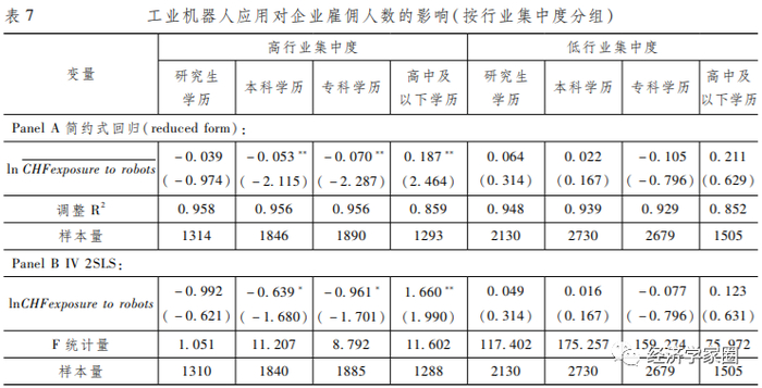 为验证上述分析,本文根据当年行业集中度中位数将样本分为高行业集中度和低行业集中度两组做分组回归。如表7所示,简约式回归结果表明,在高行业集中度的样本中,工业机器人渗透度每增加1%,会导致企业雇佣本科学历员工减少0.053%,雇佣专科学历员工减少0.07%,雇佣高中及以下学历员工增加0.187%。但是对于低行业集中度的企业而言,工业机器人渗透度对不同学历层次的员工人数均无明显影响。IV 2SLS的回归结果与上述结论一致。技术进步往往是非中性的,即不同要素部门和行为主体从技术进步中的获益存在明显差异(Acemoglu&Autor,2011)。最新研究指出,新一轮技术进步带有明显的规模偏向(scale-biased),具有规模和技术优势的大企业从技术进步中获益更多(Autor et al.,2020)。本文研究结论表明,在市场集中度较高的行业中工业机器人应用对企业劳动力需求的替代效应越明显,这一发现也为规模偏向型技术进步的理论假说提供了来自中国的经验证据。