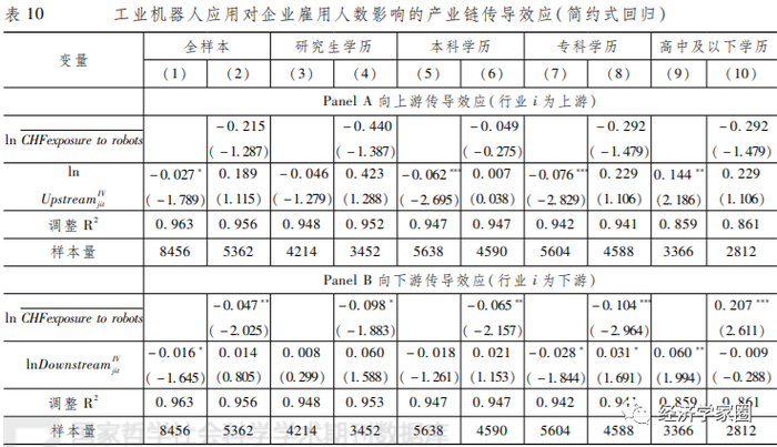 此时得到的回归系数主要反映了由中间品市场等非技术溢出途径产生的影响。表10报告了工业机器人应用对企业劳动力需求的产业链传导效应的估计结果。简约式回归结果表明,对于中国制造业企业而言,下游行业机器人应用水平变化通过产业链传导对上游行业劳动力需求的影响(向上游传导效应)可能主要表现为技术溢出,并且这种溢出效应整体呈现为挤出效应(-0.027),而由中间品市场等途径带来的影响并不显著。上游行业机器人应用水平变化通过产业链传导对下游行业劳动力需求的影响(向下游传导效应)主要表现为技术溢出,这种溢出效应整体呈现为挤出效应(-0.016),但是对专科学历劳动力需求而言,除技术溢出外,也可能通过中间品市场等途径带来一定的正面影响(0.031)。