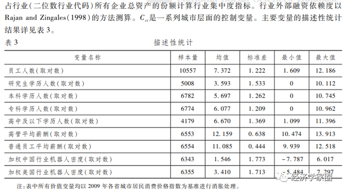 机器人应用不仅会导致企业劳动力需求和工资的总量变化,也可能会带来相应的结构调整。对不同技能结构的劳动力需求而言,机器人在替代部分可自动化工作的同时也会进一步提高企业对非自动化岗位、与机器人技能互补岗位的劳动力需求。诸多研究表明,自动化技术对中等技能劳动者的替代性最强,而与高低技能劳动者存在互补效应。因此,机器人应用可能会导致不同技能劳动者之间的“就业极化”。而在工资方面,机器人应用会使得企业利润在不同部门、不同技能员工间重新分配,可能会进一步加剧高技术人才与低技能员工间工资收入的两极分化。基于上述分析,本文提出第三个待验证的假说: