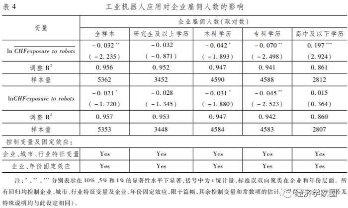 导致上述结果的原因可能在于:机器人相对于人力在一些常规性、复杂性劳动方面更具比较优势,这些工作往往由中等技能劳动力从事,因此对中等技能劳动力的替代效应更为明显。而对于技能需求较低的工作,人力相对于机器人更具比较优势,采用机器替代人反而会增加企业的生产成本。此外,在自动化生产环境下,对于不需要较高技能的一般性劳动,企业可以通过雇佣更低成本的低技能劳动力来完成,这也会增加企业对低技能劳动力的需求。