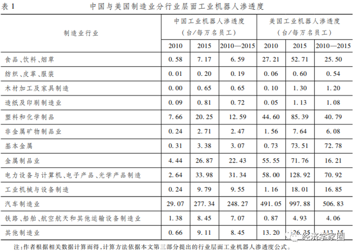与机器人存量、销量指标相比,机器人渗透度(密度)更能反映一国机器人实际应用水平。如表1所示,中国工业机器人渗透度最高的行业是汽车制造业,最低的是纺织、皮革、服装业,不同行业间的工业机器人渗透度差异较大。而与美国相比,中国制造业整体的工业机器人渗透度仍然偏低。总体来看,在中国和美国都呈现出资本密集型行业(如汽车制造、机械设备制造等)拥有更高的机器人渗透度,而传统的劳动密集型行业(如纺织服装、家具制造等)的机器人应用并不明显。