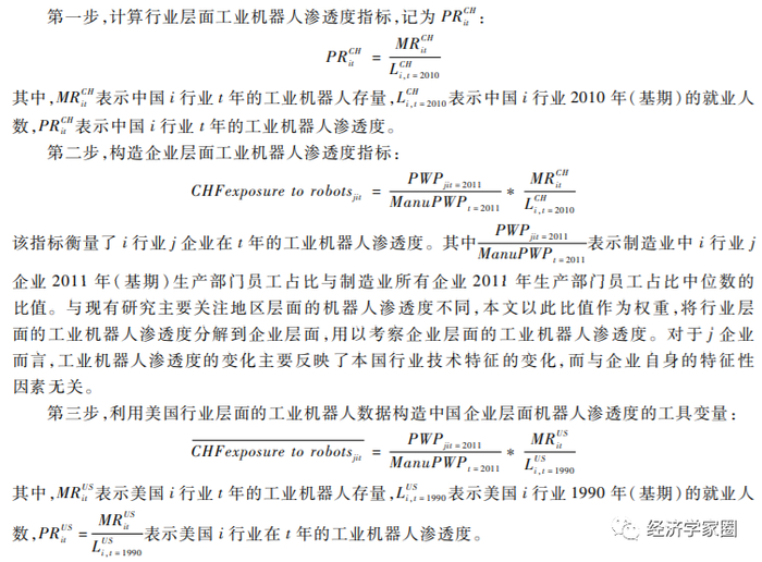 Acemoglu&Restrepo (2020)采用一般均衡模型考察了机器人应用对美国区域劳动力市场的影响,并基于模型结论构造了度量美国区域层面“机器人渗透度”的指标,其构造思想类似于“巴蒂克工具变量”(bartik instrument)(Bartik,1991;Goldsmith-Pinkham et al.,2020)。本文借鉴其方法构造中国制造业企业层面的机器人渗透度指标。具体测度方法如下: