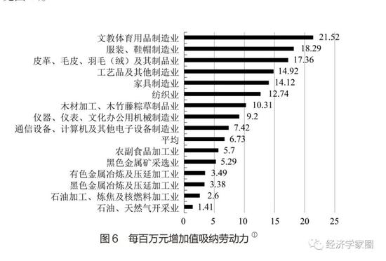 我国出口产业集中在劳动密集的产品和加工环节,吸纳就业能力明显强于面向国内的产业。在我们外循环比重最高的2006 年,百万元工业增加值的就业密度(就业人数/ 百万元增加值),工业全行业平均为6.73,而主要出口产业高得多,纺织业为12.74,服装、鞋帽制造业为18.29,家具制造业为14.12,皮革、毛皮、羽毛(绒)及其制品业为17.36,文教体育用品制造业为21.52,通信设备、计算机及其他电子设备制造业为7.42。因此,扩大出口能够更高比例地扩大就业,在当时,同等规模的内需不可能吸纳如此多的劳动力(见图6)。