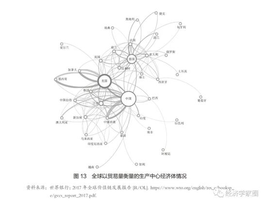 经过多年开放式发展,我国在全球产业链中的地位超过了我们在全球GDP 中的地位。图13 展示了中、美、德三国在全球产业链中的重要性,图中国家所在的圆圈大小表示其在全球产业链中的相对地位。可以看出,我国在全球产业链中的地位排名第一,超过我国GDP 在全球第二的排名。与任何国家相比,我国产业在全球产业链上的份额最大,在全球产业链中已经有重要位势。许多产业较高比重的市场和资源在国外,必须内外循环畅通整个产业才能有效运转。同时,全球产业链的波动对我们影响也最大。因此,推动全球产业链发展和维护全球产业链安全,是与我们自身发展直接相关的重大利益。