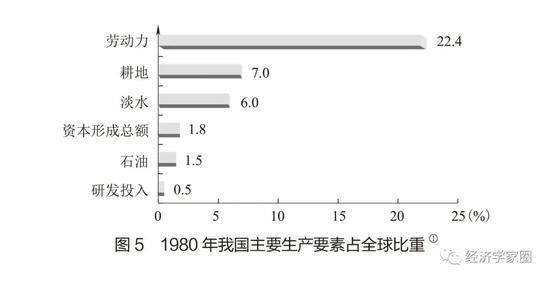 改革开放伊始,我国要素禀赋极度失衡,几种主要生产要素占全球的比重畸高畸低,其中:劳动力极为富裕,1980 年我国劳动力占世界劳动力总量的比重高达22.4%;而资金和技术极为短缺,资本形成总额占全球资本形成总额的比重仅为2%,研发投入仅为0.5%;耕地、淡水和石油资源分别占7%、6%和1.5%。如此失衡的要素禀赋,无法将较多劳动力吸纳到现代经济部门,潜在巨量内需无法实现,高比例的劳动力在农业部门隐性失业,收入极低。