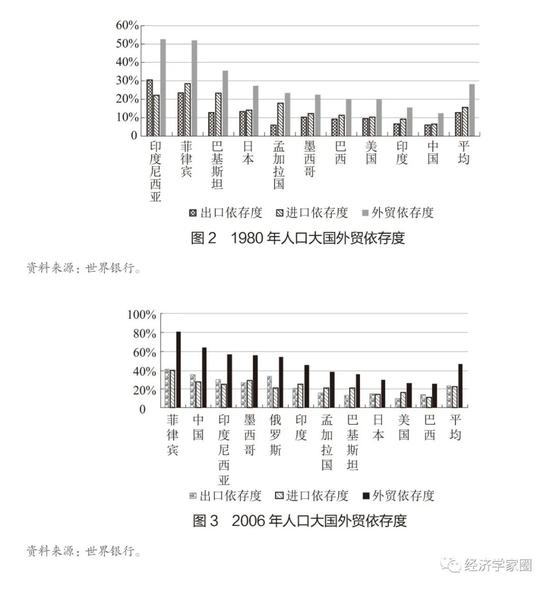 本部分做一点国际比较。下面图2、图3 和图4 分别列出改革开放初期、中期以及目前我国外贸依存度、出口依存度和进口依存度三项指标,并与人口1亿以上的大国进行比较。人口大国之间在市场规模、消费结构和产业体系等方面有相似性,可比性较强。