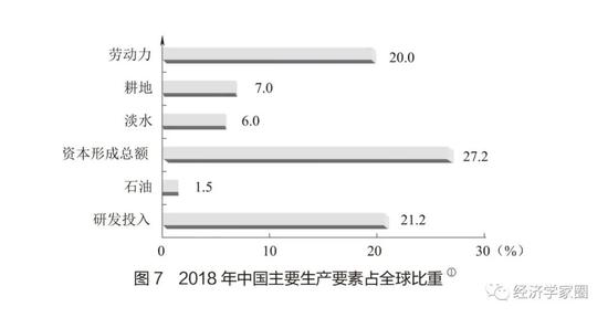 在40 年增长中,我国要素禀赋持续变化。劳动力净增长从缓慢到停滞再到下降,到2018 年,劳动力占全球的比重降至20%。同时,投资能力持续快速增长,资本成为最富裕要素,我国资本形成总额占全球资本形成总额的比重已经高达26%,研发投入紧跟其后达到21.2%,两者的比重都超过了劳动力。几类自然资源要素的短缺则更为突出(见图7)。