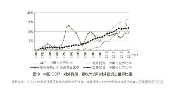 图9是过去40 年中国GDP、对外贸易、吸收外资和对外投资分别占世界GDP 总额、对外贸易总额、吸收外资总额和对外投资总额的比重,这组关系呈现出三段式特点,清楚地映射出国内要素禀赋变化对国内循环和国际循环的影响。第一段是20 世纪80 年代我国对外开放的初期阶段,对外贸易和吸收外资占全球对外贸易和外资流入的比重,低于我国GDP 占全球GDP 的比重,表明外循环对经济增长的带动作用有限。第二段是20 世纪90 年代和21 世纪前10年,我国对外贸易占全球比重总体上高于GDP 占全球的比重,吸收外资的比重更是超高,表明外循环对增长的带动作用显著。第三段是最近10 年,对外贸易、吸收外资和对外投资的比重都低于GDP 的比重,表明外循环的作用有所减弱。