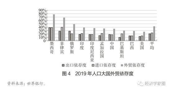 第一, 大国外贸依存度普遍提高。过去40 年,经济全球化较快推进,各国外贸依存度都有明显提高。图2、图3、图4 显示,这些国家的平均依存度从1980 年的28.1%,提高到2006 年的46.9 %,后略有回落,2019 年为43.1%。总体上看,对外贸易的地位显著提升,外循环的作用显著加强。