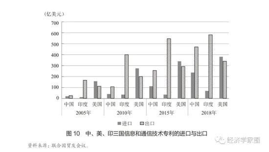 一个常见的误解是,利用外部技术资源的国家都是本身自主技术能力不足的国家。而实际情况是,技术出口大国往往也是技术进口大国,只有双向高度参与全球创新链,才能为自已带来最强的技术能力。图10 显示的是美国、中国和印度三国信息和通信技术专利进出口情况。可以看到,美国的专利进口和出口大致平衡,中国和印度都是出口明显大于进口。这并不能说明中国和印度的信息和通信技术产业水平高于美国。美国这样的技术强国却大量引进技术,这并不难理解。在代表最高技术水平的产业中,产品各部分都需要达到相应的高水平,如果是大型复杂产品系统,整机企业、关键设备企业、零部件供应商等产业链中的各部分,技术水平和产业特性需要同步迭代和平行发展。越是最高水平的产品,越是需要集成全球最高水平的技术能力,因此这类产品的全球技术网络密集。由此,最终产品生产国往往既大量出口高技术产品,又大量进口高技术零部件,成为全球创新链中的双向贸易大国。美国信息和通信技术产业水平高,一个重要原因就是大量从全球获得高水平技术资源。
