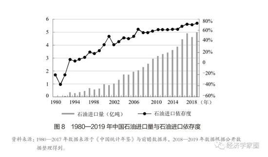 图8显示的是我国过去40 年的石油进口依存度,即石油年净进口量占年石油消费量的比重。从2006 年开始,我国石油进口依存度就超过60%,目前已经高达近80%,这表明国内石油供给量与我们庞大的经济体量对石油的需求明显不匹配,要依靠国际循环补充缺口。
