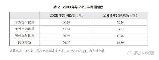 下面我们通过跨国指数的变化来说明上述变化。跨国指数由三个指标构成:第一个指标是海外资产比重,即跨国公司在海外的资产占其全部资产的比重;第二个指标是海外市场比重,即海外市场占跨国公司全部市场的比重;第三个指标是海外雇员比重,即跨国公司在海外的雇员占其全部雇员的比重。这三个指标的简单平均数,就是跨国指数。表2 是2009 年和2016 年全球最大25 家跨国公司的跨国指数。可以看出,2009 年的跨国指数高达56%,其中两项子指标超过60%;到2016 年,跨国指数有明显下降,三个子指标也全部下降。