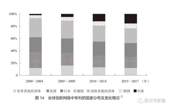 21世纪以来,中国在全球创新网络中的地位显著提升。全球创新网络在很大程度上是通过企业研发的国际化形成的。跨国公司是全球创新网络的重要载体。据笔者对在华跨国公司研发机构的调研,这些研发机构已经从20 世纪末期的“母公司技术当地化服务”为主,转向21 世纪前10 年的“母公司技术当地化服务+ 研发适合当地新产品”,再转向最近10 年的“母公司技术当地化服务+ 研发适合当地新产品+ 参与公司全球研发网络”三者并重。世界知识产权组织的调研也显示出中国在跨国公司全球研发网络中重要性的提升,20 世纪最后10 年,在全球创新网络中,中国只贡献了大约1%的专利,而在2015—2017 年,中国贡献了大约15% 的专利(见图14)。