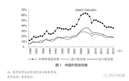 图1显示的是改革开放以来我国外贸依存度、出口依存度和进口依存度的变化。改革开放以来,中国的外贸依存度明显上升,从1980 年的14.1% 上升到2006 年的最高值64.5%,2019 年又回落至35.6%,但仍然显著高于改革开放初期的水平。出口依存度和进口依存度的变化也是相似轨迹。总体上看,外循环在国民经济中的地位显著加强,同时也呈现出从低到高再有所降低的波动。