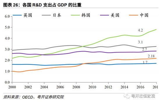 限制高新科技产品和技术的输入受阻,阻碍了我国高科技行业的创新发展,对产业链向前继续延伸造成了负面冲击。2019年据中国工程院对26类有代表性制造业产业进行国际分析比较,我国有15类产业与国际水平仍呈现较大差距,也充分暴露出我国在产业链核心环节和核心技术上存在重大缺陷。尽管近年来中国不断加大研发投入,在部分高科技领域与发达国家的差距逐渐缩小,但与发达国家相比仍有一定差距。2018年我国研发支出占GDP的比重为2.18%,分别低于韩国、日本和美国2.6、1.1和0.6个百分点。