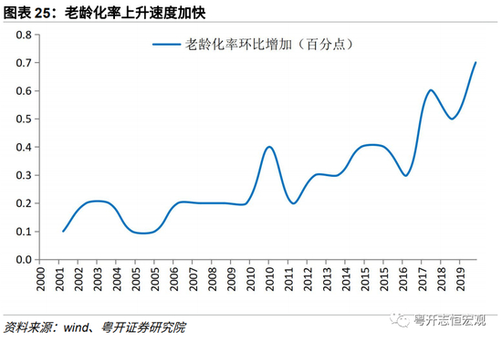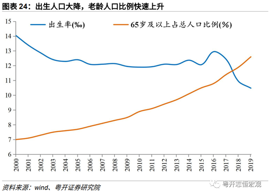 人口老龄化严重、劳动力人口比重下降、人口红利逐渐消失将对我国经济带来负面影响。从需求侧来看,老龄化降低社会总需求,进而降低耐用消费品和投资需求。总量上人口出生率下降将降低潜在与实际消费需求,结构上人口老龄化加剧,对养老金、年金等预防性资金的需求与担忧,将进一步降低其消费欲望。从供给侧来看,生育率下降降低全要素生产率和创新活力。年轻劳动力供给不足,导致劳动力支付的报酬上升,劳动成本相应增加,从而使得企业的投资减少,阻碍经济的发展;人口老龄化还会降低劳动生产率,另外,一个人最富创造力的年龄为30-40岁,当这个年龄段的人减少,创造力变少,专利数也相应减少,对国家转型升级和企业创新将会带来负面影响。