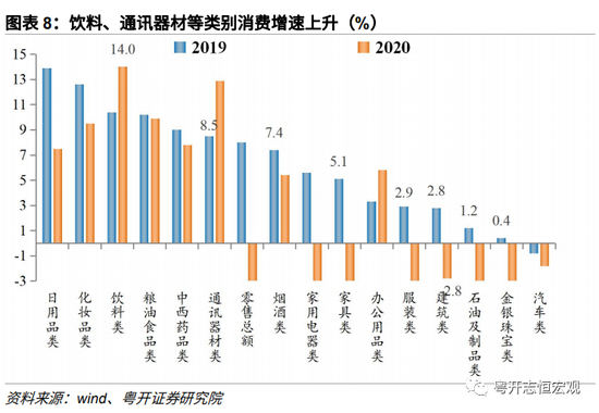 同时,全国居民人均消费支出中,服务性消费占比为42.6%,比上年下降3.3个百分点。2020年社会消费品零售总额39.2万亿元,比上年下降3.9%,增速较上年放缓11.9个百分点。从消费类别看,通讯器材类同比增长12.9%,疫情期间,居家办公、网课以及上网时间大幅增长,提高了消费者购买和更换新机的意愿;受国际油价大幅下滑、国际争端、出口受阻等因素影响,石油及制品类零售总额下降明显,同比下降14.5%;服装类及金银珠宝类等非生活必需品类商品需求低迷,同比增速分别为-6.6%和-4.7%,分别较上年增速下降9.5和5.1个百分点,带动消费增速下行。