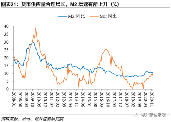 去杠杆方面,受疫情影响,2020年全年宏观杠杆率从2019年末的246.5%上升至270.1%,增长了23.6个百分点,但增幅呈逐季回落态势,四季度已出现“去杠杆”,四季度较三季度下降1.1个百分点。在相对宽松的货币政策下债务增速上升和经济增速放缓是主要驱动因素。