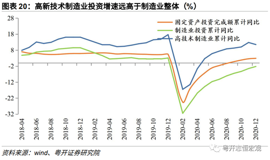 制造业投资增速为负,但累计降幅整体上逐月收窄。制造业投资受到企业盈利水平边际改善和信贷支持的提振,需求改善及产能利用率上升预示产能上升周期开启。其中高技术制造业同比增长11.5%,增速比制造业投资整体快13.7个百分点。2020年计算机通信、专用设备制造、金属制品投资分别同比增长12.5%、-2.3%和-8.2%。偏下游的行业如农副食品加工、纺织业、化学原料及制品分别为-0.4%、-6.9%、-1.2%。受2020年新冠疫情的影响,以及人口老龄化趋势明显,政府持续加大医疗卫生事业的投入,医药制造行业投资增速达到了28.4%。
