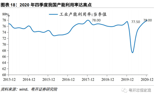 2021年全球经济因疫苗研发和接种而重启,中国经济增长的主要支撑力从2020年的房地产和出口切换到2021年的消费、制造业投资和出口。具体图景是:一是出口主要从防疫物资出口(疫情错位和政策差异)切换到全球经济恢复逻辑;二是消费主要是因为就业和收入边际好转,餐饮和服务业恢复;三是制造业投资受到企业盈利水平边际改善和信贷支持的提振,产能周期上升。当前内外需持续修复,企业主动补库存,产能利用率创供给侧结构性改革以来新高。2020年四季度产能利用率达到78%。