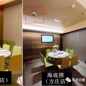 近日,“海底捞在包间里安装摄像头”的消息引起网友热议。面对“是服务还是监控”的质疑,海底捞客服表示,包间属于餐厅,也是公共场所一部分,安装摄影头为记录情况。北京日报(ID:Beijing_Daily)记者走访其他品牌餐饮企业发现,饭店包间装摄像头的现象并不罕见,部分包间内也没有“内有监控”等相关提示。