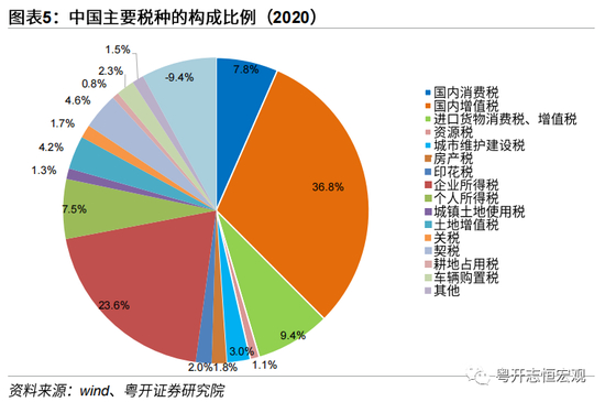 从各类税种占比来看,当前增值税、企业所得税、个人所得税和消费税是我国的主要税种。2020年,国内增值税和企业所得税分别为我国第一和第二大税种,占总税收比重分别为36.8%和23.6%。此外,进口货物消费税及增值税占比9.4%,个人所得税占比7.5%,国内消费税占比7.8%,契税、土地增值税和城建税占比分别是4.6%、4.2%和3.0%。