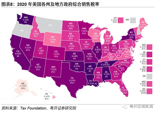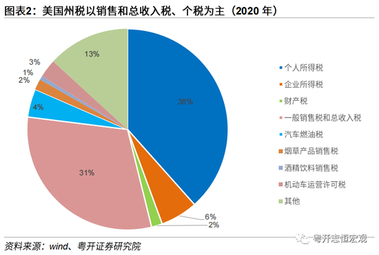 2)州税以个人所得税和销售税为主。受疫情影响,2020年美国州政府税收为1.1万亿美元,较上年下降1%。其中州税主体税种是个人所得税、销售和总收入税,分别占税收比重的38.4%和30.8%。其中,销售税是零售税,是对在州辖区内消费者购买货物和劳务征收的税。由于销售税是州级税收,因此各个州的税率不尽相同,且有的州允许州以下地方政府一起捆绑征收销售税。美国有5个州尚未开征州级销售税:阿拉斯加州、特拉华州、蒙大拿州、新罕布什尔州和俄勒冈州,其中阿拉斯加州和蒙大拿州允许地方政府收取地方销售税。此外,2020年企业所得税占比6.0%,汽车燃油税占比4.5%,财产税占比1.8%。