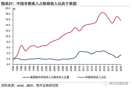 3)大口径宏观税负是税收收入、非税收入以及社会保险费(税)的收入除以GDP。近年来美国大口径宏观税负水平与中国基本相当,主要是因为中国非税收入占财政收入比重仍较高。中国的非税收入主要包括专项收入、行政事业性收费、罚没收入和其他收入。2020年中国非税收入占财政收入比重为15.6%。美国联邦层面的非税收入占财政收入比重不足4%。