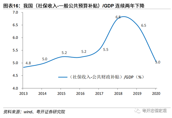 2008年及之前美国宏观税负高于中国全口径的宏观税负,2005年美国较中国高4.5个百分点(美国27.5%,中国23%)。2008年及以后中国宏观税负迅速超过美国,2009和2010年中国高于美国3.7个百分点(2009年美国24.9%,中国28.5%)和7.2个百分点(2010年美国25.6%,中国为32.8%),主要源于中国2009年和2010年土地出让迅速增长带动政府性基金的增速分别为17.3%和100.6%。2018年全口径下的中国宏观税负35.2%,大幅高于美国9个百分点,主要原因是社保和土地出让收入上升较快,而以税收收入、财政收入衡量的宏观税负是下降的。2019-2020年,我国土地出让/GDP再度上升;但是,剔除一般公共预算补贴后的社保费收入/GDP下降幅度较大,从2018年的6.8%下降至2019的6.5%和2020年的5.0%,成为全口径宏观税负下降的主要原因。2020年全口径下中国宏观税负为32.7%,仍高于美国的27.1%,但整体中美全口径宏观税负差距正在缩小。