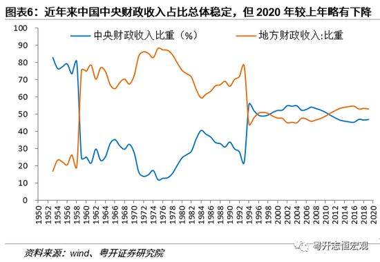 中央、地方政府的财政收入占全国财政收入的比重相对稳定。2020年中央财政收入占全国财政收入比重为45.3%,较上年下降1.6个百分点,地方占比54.7%。税收收入占全国财政收入比重逐年下降,由2000年的93.9%下降到2019年的83%,2020年有所回升至84.4%。