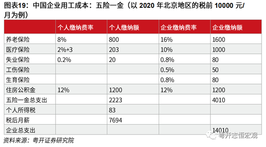 社会保险费用支出即通常所说的“五险一金”中的五险,企业承担的住房公积金也是成本之一。以2020年北京地区税前月薪10000元为例,企业需要额外承担的“五险一金”成本为4010元,企业缴纳的“五险一金”为工资成本额外的40.1%。扣除“五险一金”和个人所得税之后员工拿到手的现金工资仅为7694元。