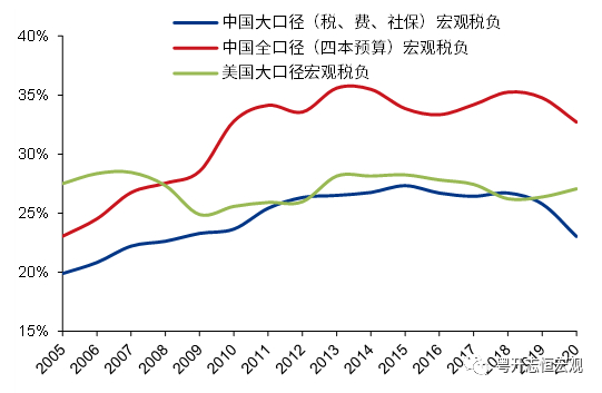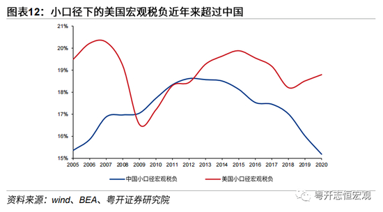 1)小口径宏观税负,即用不包含社保税(费)的税收收入除以GDP,自2013年以来,中国小口径宏观税负持续低于美国。在持续大规模减税降费后,2020年中国的小口径宏观税负水平已低于美国3.6个百分点。