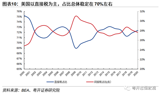 美国的直接税主要包括个税、企业所得税、财产税、社会保险税、牌照税、遗产及赠与税。截至2020年底,美国的直接税达到3.89万亿美元,占税收比72.4%,整体维持70%以上水平。直接税占比较高背景下,税收对经济周期逆周期调节效应更大:在经济过热时,随着收入和盈利好转,个人和企业所得税等直接税适用税率会自动跳升到更高档次,从而给经济降温;在经济下行周期,收入和盈利减少趋势下,直接税适用税率会下降到更低档次,起到自行减税效果,从而鼓励投资和消费。